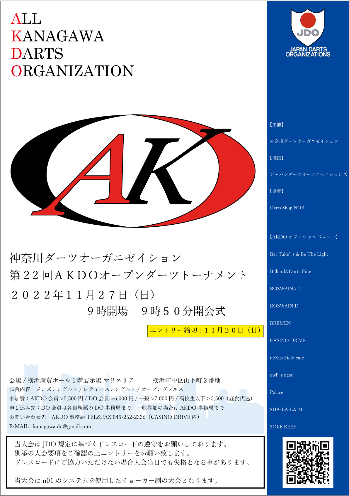 | 大会名称 | 第 22 回 AKDO OPEN DARTS TOURNAMENT |